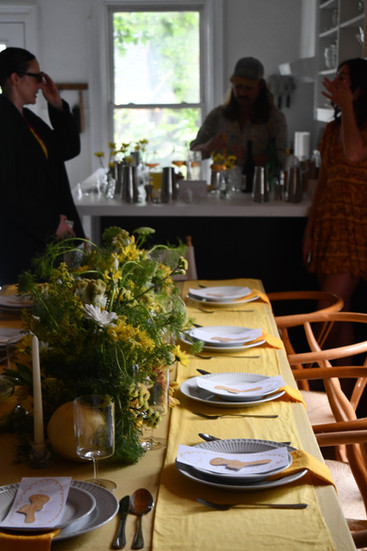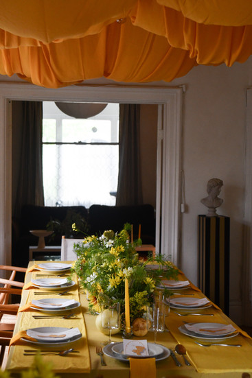 This dinner was exactly that. A slow summer evening wrapped in yellow, a table that felt like memory. The table sat beneath a soft canopy of marigold fabric, draped like late-summer sky. The idea for the canopy was sparked years ago, when my mom took me to Central Park as a child to see Christo and Jeanne-Claude’s saffron gates—an installation that showed me how fabric could transform space into something monumental yet fleeting. That vision lingered, and here it reappeared, reimagined above the table.