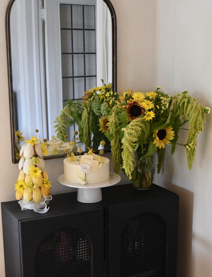 The menu carried the same yellow inspired thread: chilled sweet corn soup with chive oil and microgreens; shaved zucchini ribbons with pine nuts and ricotta; roasted chicken glazed with citrus and honey. And for dessert, a beautiful lemon cream cake alongside a yellow ombré madeleine tower from Café Pastel, adorned with fresh blooms. Every dish, in its own way, was a study in yellow: bright, sun-warmed, and deeply seasonal.