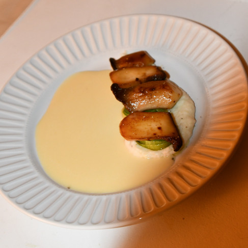 The menu was paced to support the evening’s gentle progression, opening with a warm Ontario parsnip velouté finished with white miso and chive oil, a soft and comforting beginning that set a calm foundation. A chicory and pear salad followed, balancing radicchio and endive with shaved pear, toasted hazelnut, and crème fraîche vinaigrette for a restrained contrast of bitter and sweet. At the centre of the meal, ricotta gnocchi with browned butter, lemon zest, crispy sage, and Parmigiano Reggiano felt grounding and generous, anchoring the table midway through the evening. Pan-roasted halibut came next, served with cauliflower purée, sautéed leeks, and beurre blanc, clean and delicate in its restraint. The meal closed with a meringue nest filled with vanilla whipped cream and white and yellow plum, offering a light, quiet sense of completion.
