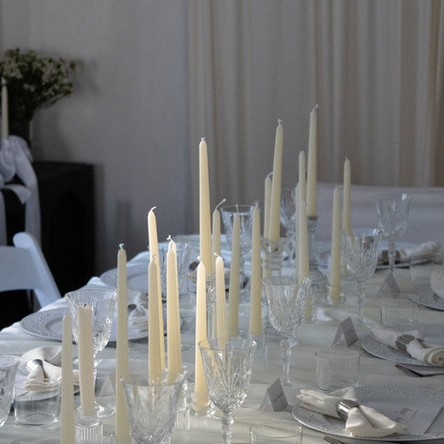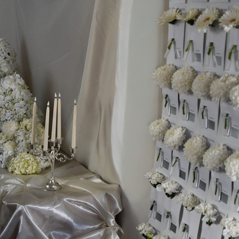 Above the table, a floating branch installation stretches across the room, bare and sculptural, reflecting winter’s restraint and the clarity of a pared back season. Below, the table remained intentionally simple, with soft ivory linens, clear glassware, and a line of candles carrying light through the space. To one side, a hydrangea tower sat in quiet contrast, cloud-like and full, offering softness against the restraint overhead. Along the wall, a flower grid introduced what is yet to come, building slowly as the evening unfolds. Together, the elements balance restraint and promise, shaping a room defined by preparation rather than arrival, and a beginning that allows meaning to form in its own time.